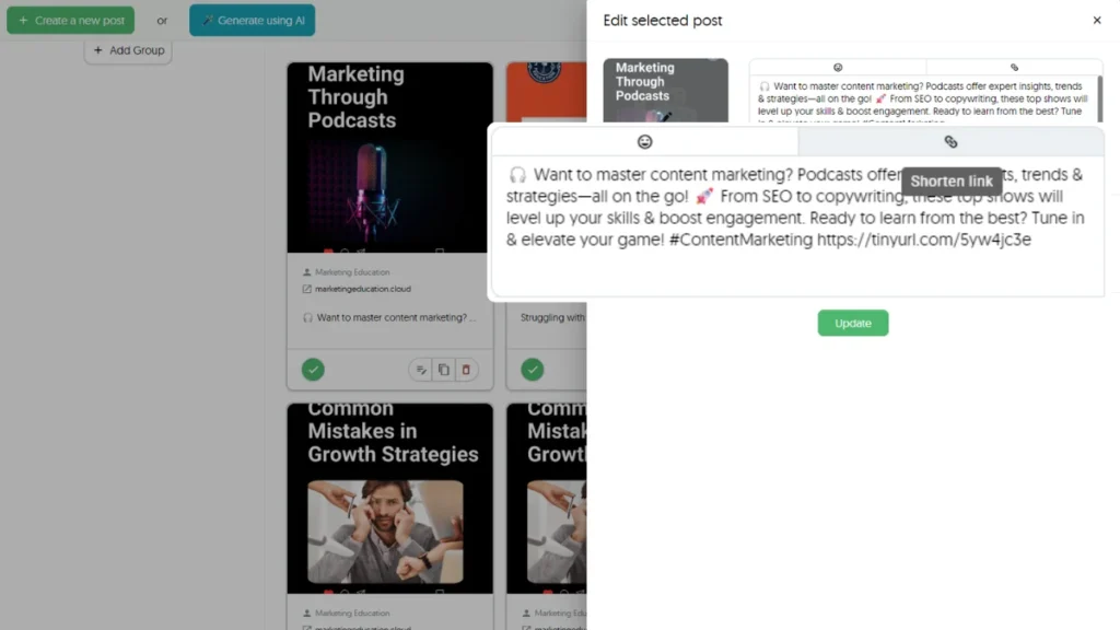 With this feature, you can shorten any link right inside your post editor. It works while you’re scheduling, planning, or even updating past content. There’s no need to copy and paste from other services. This keeps everything in one place and saves time during the posting process.